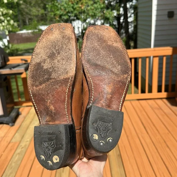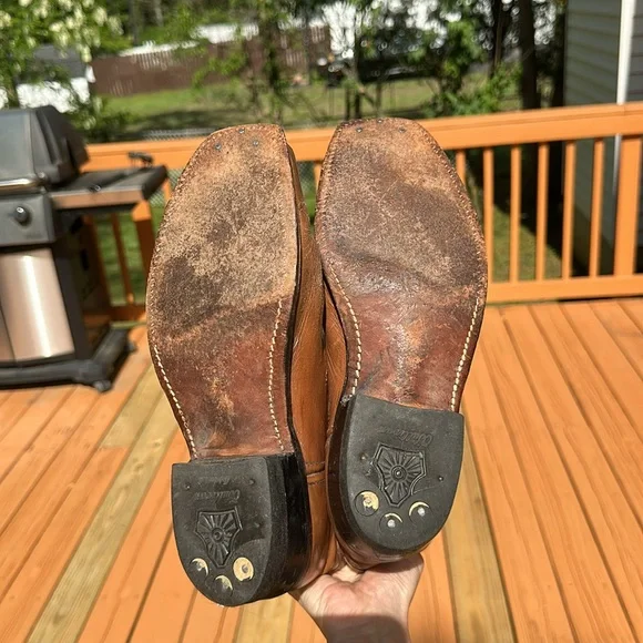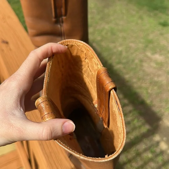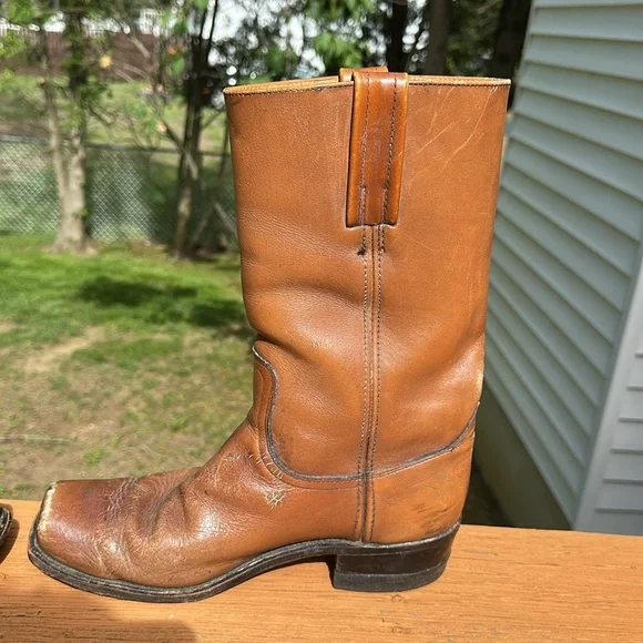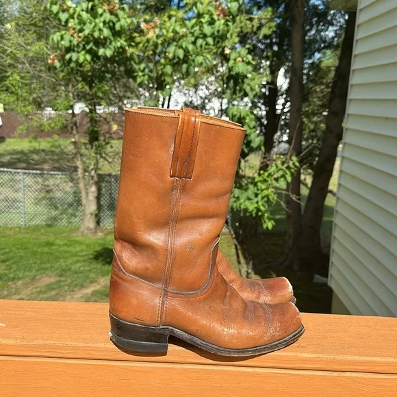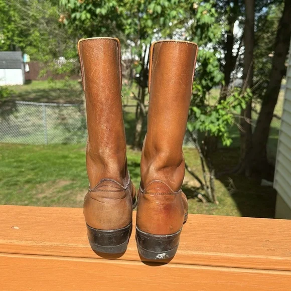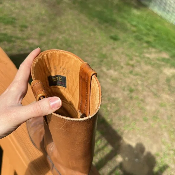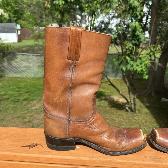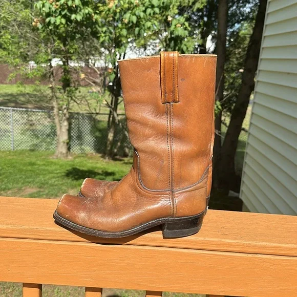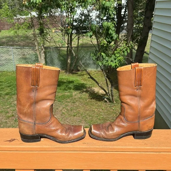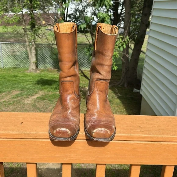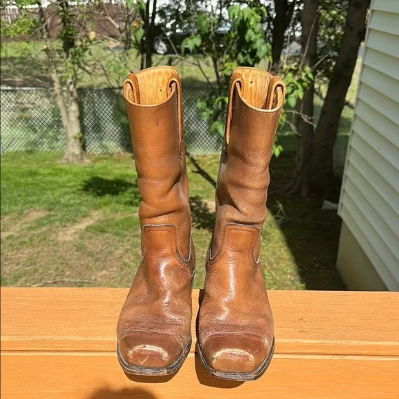 Stylish brown leather boots. Perfect for any occasion.Showing signs of wear they are starting to peel on the insideThese are used vintage and show wear. Please note the leather inside the boot shaft is flaking. Please see pics for details.Size 10D Men's / Women's 1112" Pull-on boot, square toe, outside leather pull straps, hand stained brown cow hide, Style #9023Love these vintage Frye, black label boots from the 1973 catalog! Wear on toe, heels are worn down a little, some stain spots (see pictures).